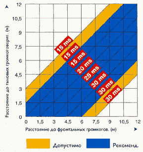 Взаимное подключение компонентов и установка громкоговорителей не заканчивают процесс обустройства домашнего кинотеатра, поскольку комплект аппаратуры необходимо еще настроить. Для центрального канала предусмотрено три способа включения: "фантомный" (центральный громкоговоритель отсутствует, а его функции выполняет пара фронтальных), Normal (для малой компактной центральной акустической системы, установленной под или над телевизором) и Wide (для трех одинаковых фронтальных акустических систем). Совет: если центральная акустическая система не передает частоты ниже 70 Гц (это можно узнать из паспортных данных), то следует использовать режим Wide, особенно на низких уровнях громкости. Этот режим будет обеспечивать более выразительное пространственное звучание. В самом начале настройки необходимо сравнить уровни всех громкоговорителей и установить их на одинаковую величину поскольку именно в этом случае наиболее ярко проявляется пространственный эффект. Наиболее объективную настройку поможет осуществить измеритель акустического давления. Но если у вас нет желания отдать за прибор, который понадобится один или два раза, около 130 долларов, то следует положиться на свой собственный слух и установить одинаковую громкость звучания всех каналов по сигналу встроенного генератора шума, который поочередно подается на каждый канал. Одним из главных условий высокого качества пространственного звучания является правильное запаздывание звука тыловых каналов по отношению к фронтальным. Декодеры Dolby Pro-Logic обеспечивают установre запаздывания, как правило, в диапазоне от 15 до 30 мс(а некоторые модели и больше); стандартной величиной является 10 мс. Оптимальная величина запаздывания зависит от удаления слушателя от фронтальных и тыловых систем. Величины запаздывания (в миллисекундах), рекомендуемые сцепиалистами фирмы Dolby, приведены на диаграмме.