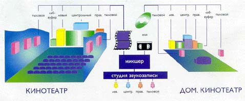 - это то, что можно иметь дома. Хотя эта система носит иное название, однако декодеры Dolby Surround работают аналогично декодерам Dolby Stereo. Разница заключается лишь в том, что в главных каналах не используется система шумоподавления. Если кинофильм, озвученный Dolby Stereo, стереофонически переписан на видеокассету, видеодиск или же передан по кабельным или спутниковым телеканалам, то озвучание сохраняется таким же, как и в кинотеатре, отсутствует лишь шумоподавление. Каждая такая кассета, диск или телепередача приносят в наш дом информацию о пространственном звуке в закодированном виде. Если мы хотим ее услышать, необходимо приобрести декодер Dolby Surround, который выделит звучание дополнительных каналов из смеси. Хотя первые декодеры Dolby Surround появились еще в 1982 году однако эго была скорее лишь проба сил, а не полномасштабное внедрение. В дальнейшем декодеры стали выпускаться как самостоятельные блоки или в комплекте с усилителями мощности, а также как составная часть телевизоров, спутниковых тюнеров, видеомагнитофонов и проигрывателей видеодисков. Система Dolby Surround существует в двух вариантах: упрощенном и более совершенном - с дополнением к ее названию двух слов: Pro-Logic. Оба варианта работают с любым "долбированным" звуком. Хотя более дешевая пассивная система Dolby Surround (выделяющая лишь тыловые каналы) и обеспечивает неплохие результаты, однако фронтальные каналы она не отделяет так хорошо, как профессиональная Dolby Stereo. Активная система Dolby Surround Pro-Logic копирует все, что происходит в кинотеатре. Это означает, что она, во-первых, выдает совершенно самостоятельный центральный канал, по которому передаются диалоги, а во-вторых, лучше разделяет информацию, относящуюся к отдельным каналам. Его матричный декодер с логикой (отсюда следует название Pro-Logic) точно определяет место, откуда должен раздаваться звук. Система THX